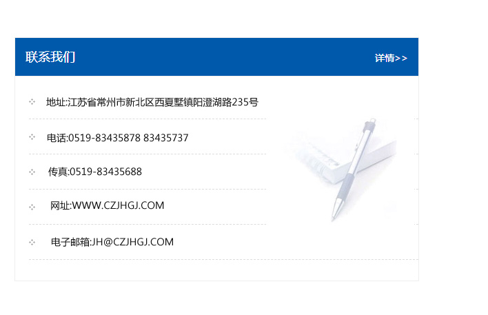 地址:常州市新北區友邦商務大廈1幢16、17層  電話:0519-85101652  傳真:0519-85112595  郵編:213022  網址:www.cz-jiayue_cn.jzfwzg.com  郵箱:xiajifengaa@163.com